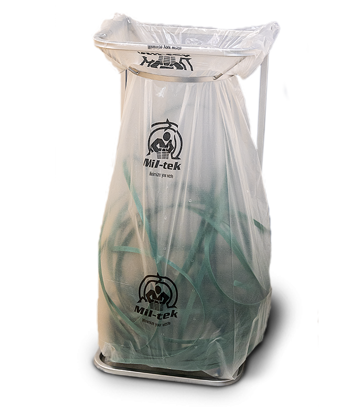 Con questa soluzione semplice ma efficace, puoi tenere sotto controllo i rifiuti di nastri di plastica. Raccogli e conserva i nastri di plastica in porta sacchi posizionati strategicamente in tutta l’azienda, quindi comprimili con una pressa Mil-tek per ridurne il volume. Un modo pratico per gestire i nastri di plastica.